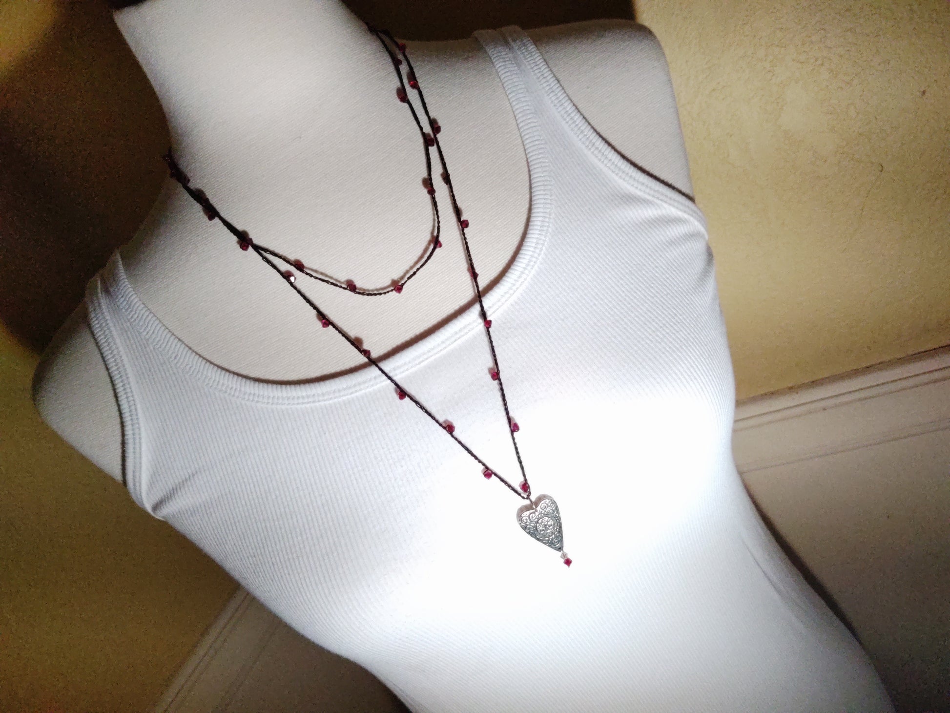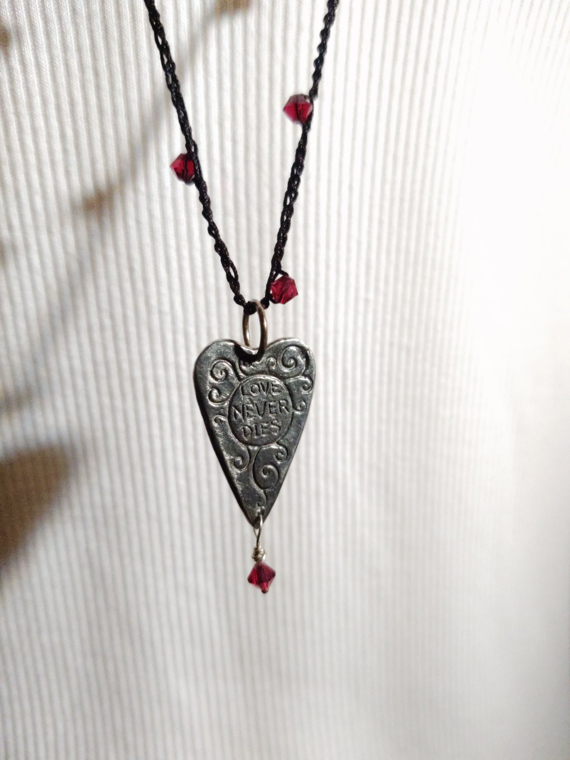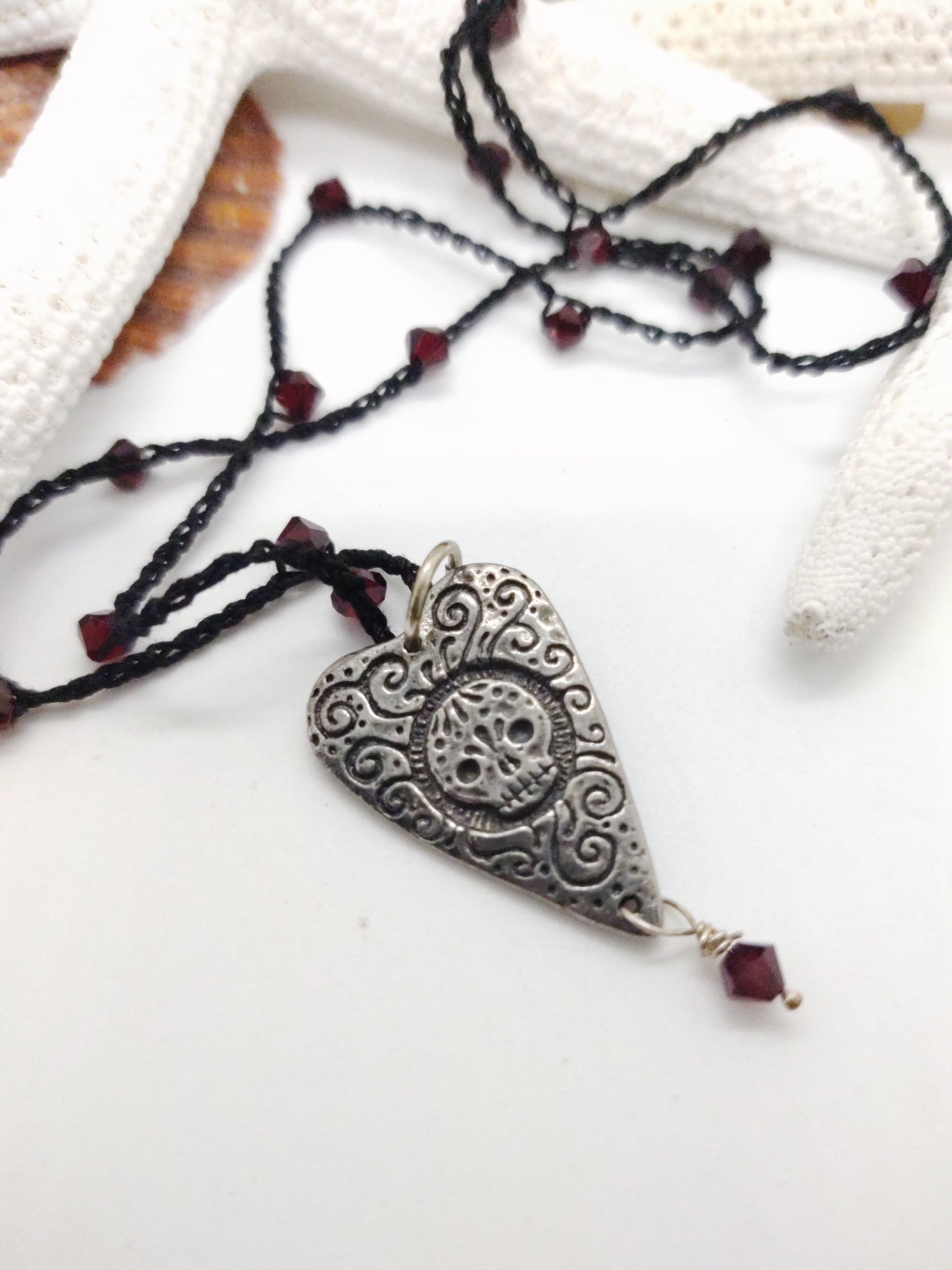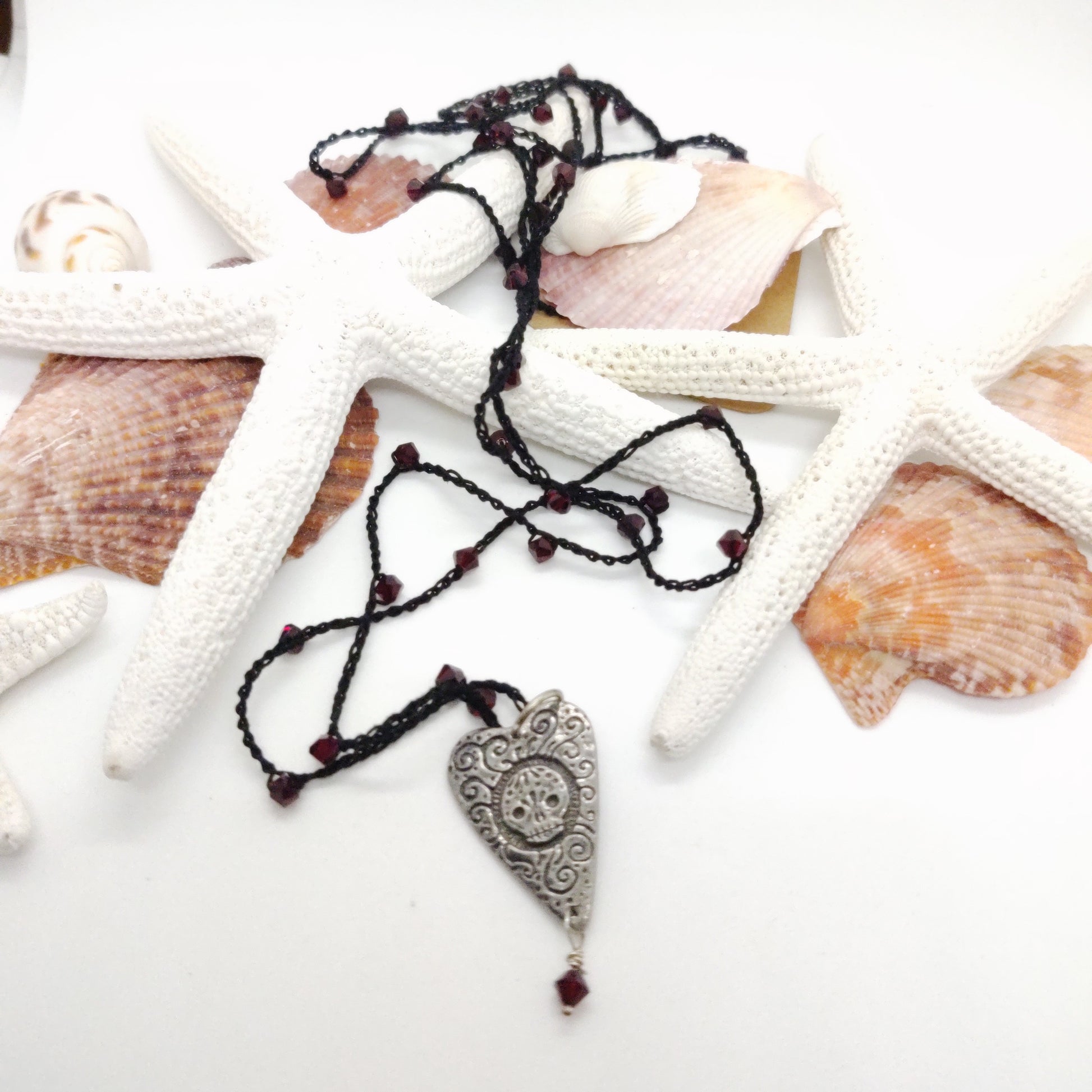 Boho chic, simple all alone or layered with other necklaces. Red bicone crystals crocheted onto 100% Egyptian cotton thread. A simple pewter charm featuring a sugar skull on one side and the quote "love never dies" on the other and a Swarovski crystal dangle. Findings are sterling silver. Length of necklace is about 36"