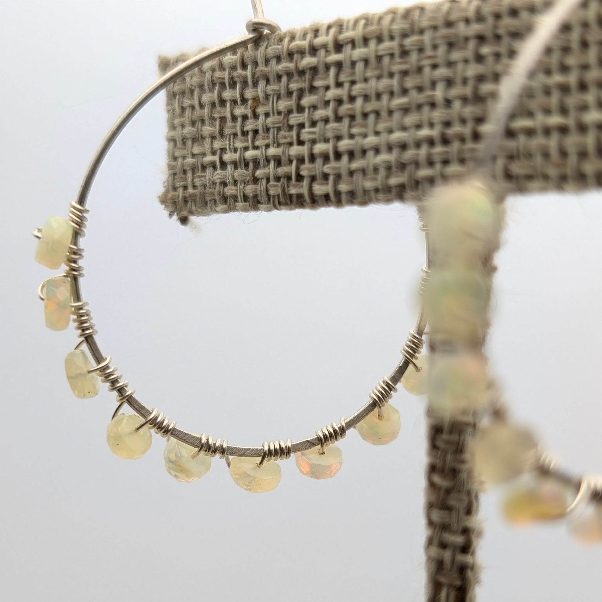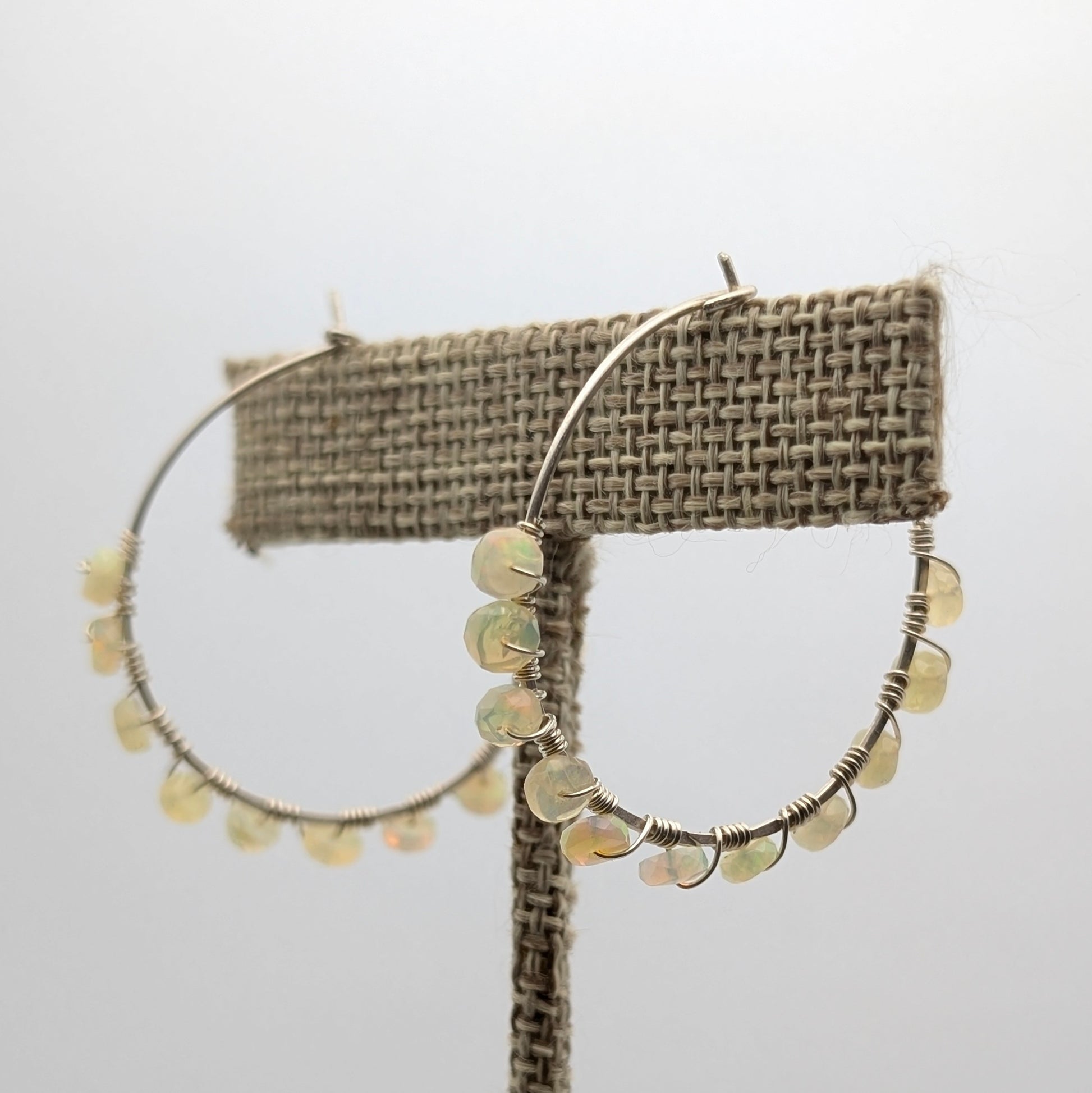 Handcrafted sterling silver hoops wire wrapped with tiny opals.