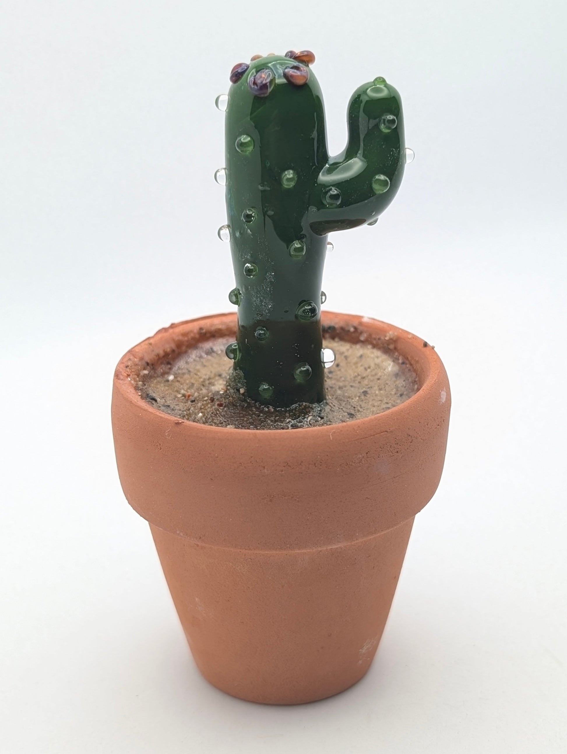 Tiny handmade glass cactus in a tiny terra cotta pot.