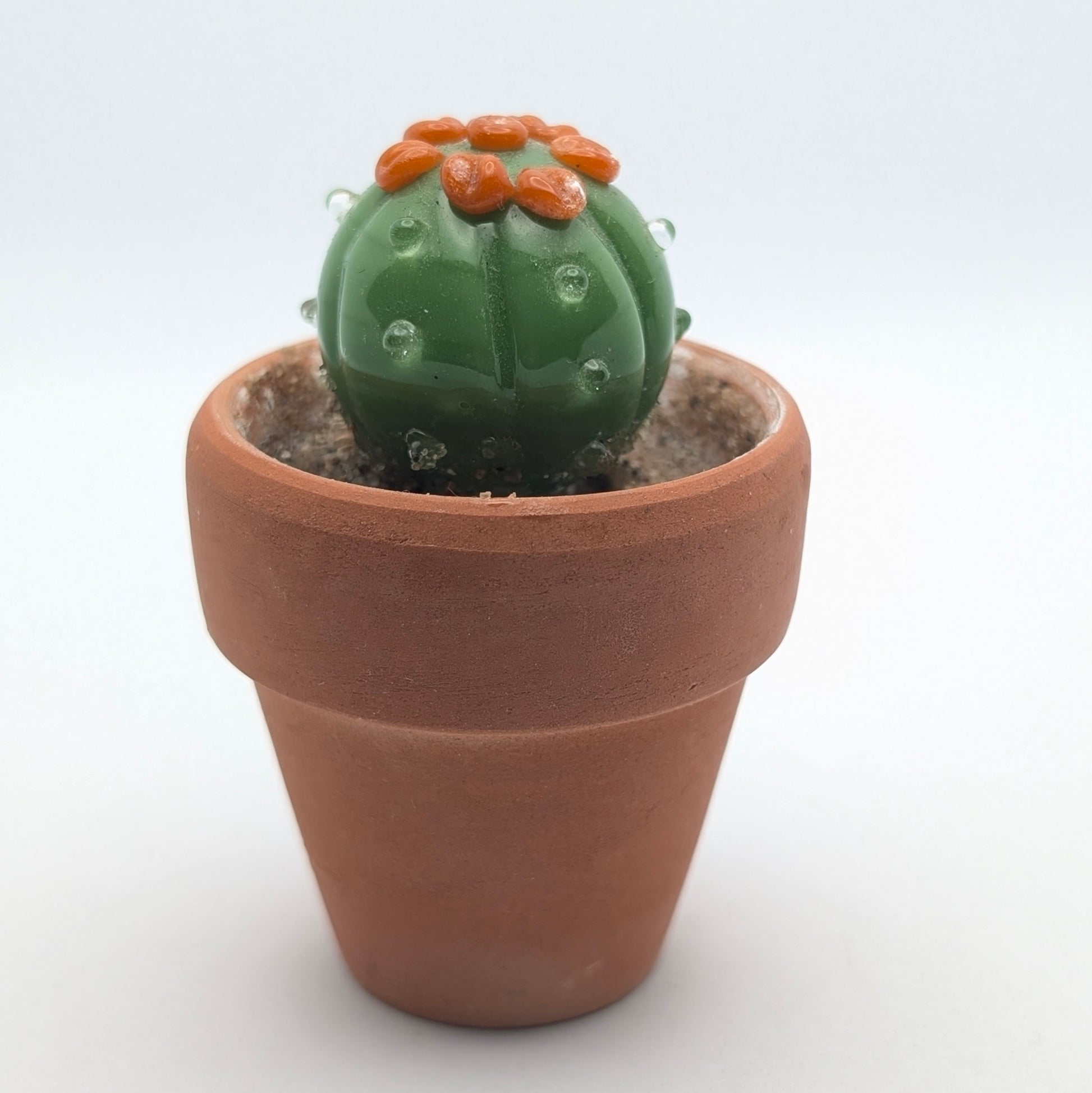 Tiny handmade glass cactus in a tiny terra cotta pot.